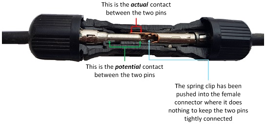 You can also see from this cut-away photo above that there's precious little of the two halves of the MC4 connector that actually make contact. One third of the possible connection is actually made, and very poorly at that. The spring clip has also been pushed up inside the female connector and so does nothing to improve the connection between the two halves.